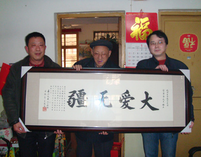 嘉興的民建會員付乃池老人70多歲了,以前患有嚴重的高血壓和哮喘病,家中經濟困難,無法有效醫治,有了東華的資助金,他積極進行治療,身體得到很好康復??吹轿繂柦M的人員,他流下了感激的淚水,還特地做了一幅“大愛無疆”的匾額送給宣董事長。旁題:君以仁愛之長期結對幫扶眾人,慷慨解囊,人均年萬余元。吾乃耄耋之年,貧病交加,喜得先生資助,月月如是,年復一年,恰似春風甘露,老朽得以頤養天年,不勝感激,僅聊表寸心。表達了他的感激之情。