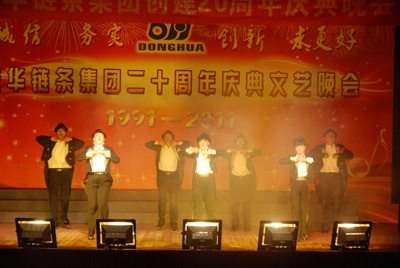 整場慶典晚會由18個文藝節目組成,其中16個節目由東華員工自編、自演,這些節目包括歌舞、小品、雜技、啞劇等等,節目集思想性、藝術性和觀賞性為一體。員工們以優美的歌聲、輕盈的舞姿、蓬勃的激情,充分展示了東華創建20年來所發生的巨大變化和取得的輝煌業績,栩栩如生地體現了東華兒女團結奮進、求真務實、開拓創新的良好形象和精神風貌。宣碧華董事長的一首清唱《讀毛主席的書》,把整臺晚會推向了高潮,員工們掌聲不斷。