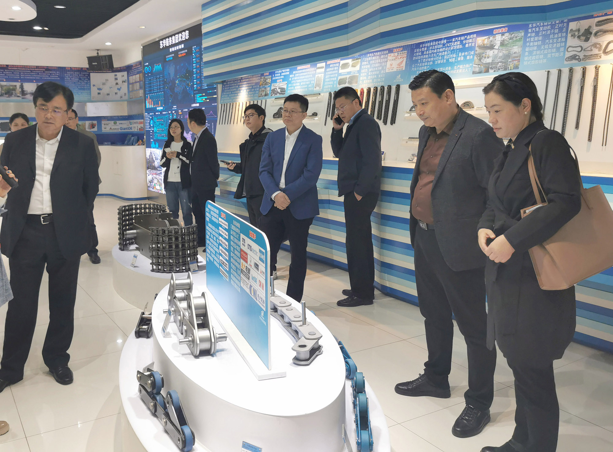 胡主任一行聽取介紹后,對東華的行業(yè)地位、綜合實(shí)力、四全兩化建設(shè)取得的成就表示贊許。他說,東華鏈條不愧是居國內(nèi)鏈傳動(dòng)行業(yè)第一,世界鏈傳動(dòng)行業(yè)前二位的企業(yè),生產(chǎn)三萬多種鏈條,十萬多個(gè)規(guī)格,廣泛應(yīng)用于社會各行各業(yè)。安徽省有許多大型的機(jī)械企業(yè),相信你們都有配套,希望你們多到安徽參觀交流,與我們本土企業(yè)有更多的合作。