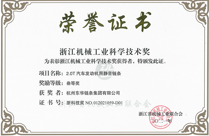 6月30日,浙江省機械工業(yè)聯(lián)合會召開會員大會。會上表彰2021年度浙江機械工業(yè)科學(xué)技術(shù)獎,全省機械領(lǐng)域共有72項科技創(chuàng)新項目獲獎。東華 “2.0T汽車發(fā)動機用靜音鏈條”和“高穩(wěn)定性雙吊耳立體停車庫鏈條”均獲三等獎,這是東華產(chǎn)品創(chuàng)新項目連續(xù)十年榮獲浙江機械工業(yè)科技獎,也是2021年度全省機械行業(yè)科技創(chuàng)新成果獎中唯一鏈傳動企業(yè)的高端產(chǎn)品獲獎。