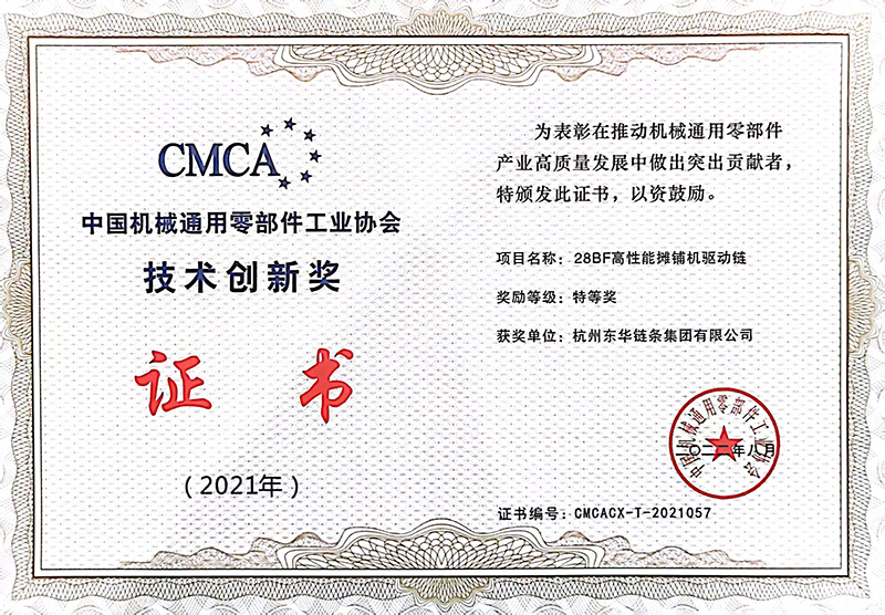 東華鏈條榮獲特等獎、優(yōu)秀獎各5項。5項特等獎分別是:東華鏈條集團開發(fā)的28BF高性能攤鋪機驅(qū)動鏈、東華興化公司開發(fā)的32BSPF高精度高耐磨鏈條、盾牌公司開發(fā)的P224.7F1驅(qū)動輸送鏈和M224F-S-250地拖輸送鏈、自強公司開發(fā)的C-24SSLR自潤滑梯級鏈條;5項優(yōu)秀獎產(chǎn)品及高端裝備分別是:東華鏈條集團開發(fā)的2.0T汽車發(fā)動機用靜音鏈條、東華興化公司開發(fā)的C2062HSSGR高耐磨輸送鏈、盾牌公司開發(fā)的P200F280K2輸送鏈、HB50.5F41空心銷軸鏈條鉚頭機和PO152F48棕櫚油輸送鏈裝配機。