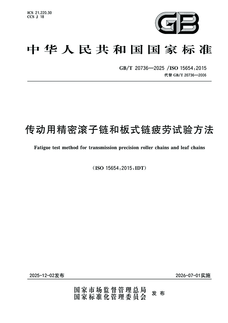 近日,國家市場監(jiān)督管理總局和國家標(biāo)準(zhǔn)化管理委員會聯(lián)合發(fā)布了261項推薦性國家標(biāo)準(zhǔn)。其中,由全國鏈傳動標(biāo)準(zhǔn)化技術(shù)委員會歸口、東華鏈條集團(tuán)負(fù)責(zé)及參與研制/修訂的兩項新版鏈傳動國家標(biāo)準(zhǔn)正式獲批,分別為GB/T 20736—2025《傳動用精密滾子鏈和板式鏈疲勞試驗方法》和GB/T 6074—2025《板式鏈、連接環(huán)和槽輪 尺寸、測量力、抗拉載荷和動載載荷》。兩項新標(biāo)準(zhǔn)將于2026年7月1日起實施。