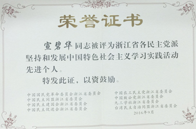 日前,浙江省各民主黨派堅(jiān)持和發(fā)展中國(guó)特色社會(huì)主義學(xué)習(xí)實(shí)踐活動(dòng)宣傳展示會(huì)在杭州召開。會(huì)議共表彰了22位浙江省各民主黨派堅(jiān)持和發(fā)展中國(guó)特色社會(huì)主義學(xué)習(xí)實(shí)踐活動(dòng)先進(jìn)個(gè)人,我集團(tuán)董事長(zhǎng)宣碧華榮獲“浙江省民主黨派學(xué)習(xí)實(shí)踐活動(dòng)先進(jìn)個(gè)人”稱號(hào),成為浙江省民建3位先進(jìn)個(gè)人受到表彰。