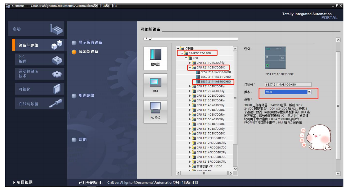 2.打開(kāi)博圖軟件,新建項(xiàng)目、添加設(shè)備,找到對(duì)應(yīng)設(shè)備系列、型號(hào)、版本等,添加。