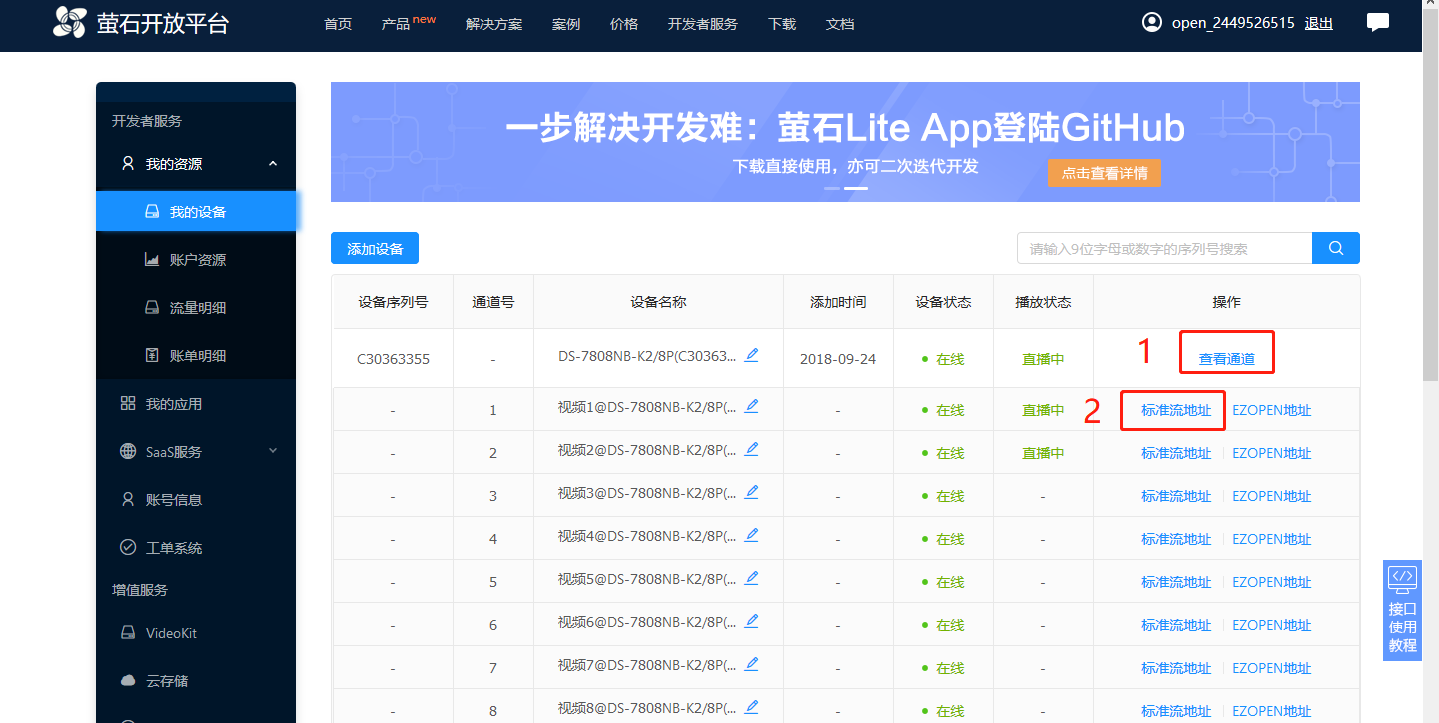 進入螢石云平臺點擊【查看通道】,點擊【標準流地址】,