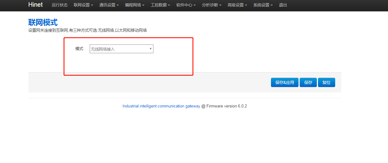 1. 網(wǎng)關(guān)后臺(tái)聯(lián)網(wǎng)模式是否正確,進(jìn)網(wǎng)關(guān)后臺(tái),點(diǎn)擊“聯(lián)網(wǎng)設(shè)置 - 聯(lián)網(wǎng)模式”,修改模式為“無線網(wǎng)絡(luò)接入”,再點(diǎn)擊【保存應(yīng)用】,重啟網(wǎng)關(guān)生效。