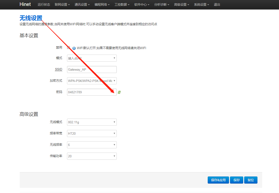 2.WIFI密碼是否正確,進(jìn)網(wǎng)關(guān)后臺(tái),點(diǎn)擊“通訊設(shè)置 - 無線設(shè)置”,點(diǎn)擊顯示密碼圖標(biāo),確認(rèn)密碼。