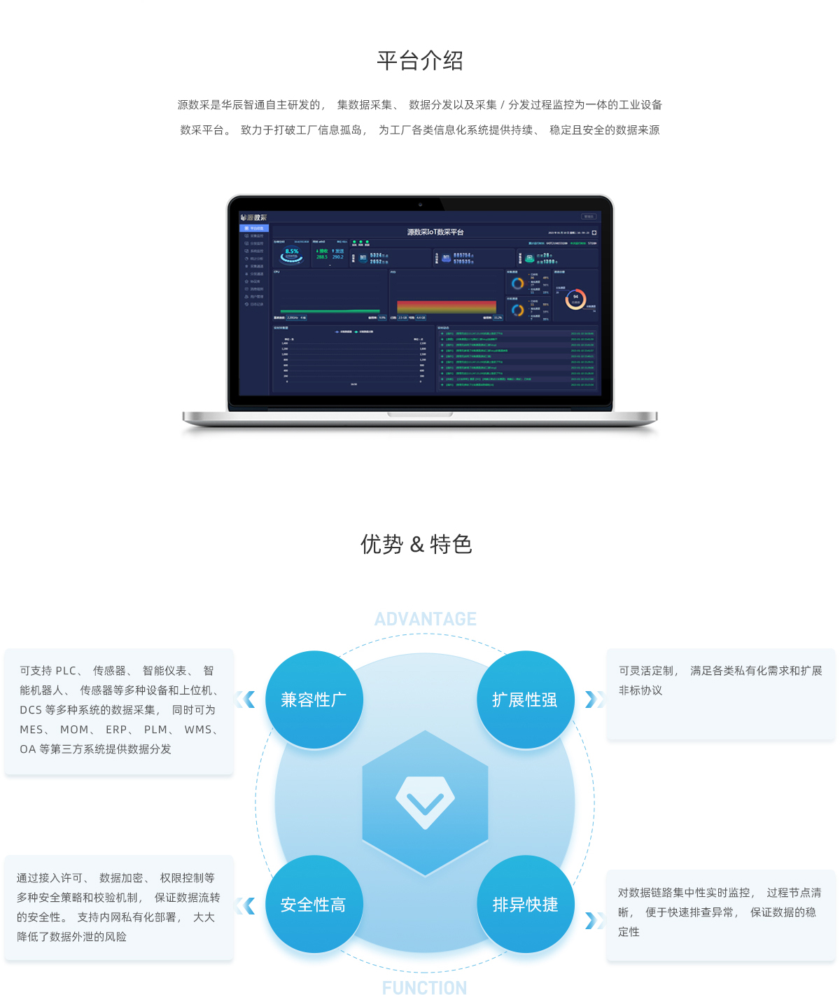可支持PLC、傳感器、DCS、上位機(jī)、數(shù)控機(jī)床、智能儀表、智能機(jī)器人等多種類型的網(wǎng)絡(luò)傳輸協(xié)議的設(shè)備數(shù)據(jù)采集,也可為各類MES、MOM、ERP、PLM、WMS、OA系統(tǒng)提供數(shù)據(jù)分發(fā)